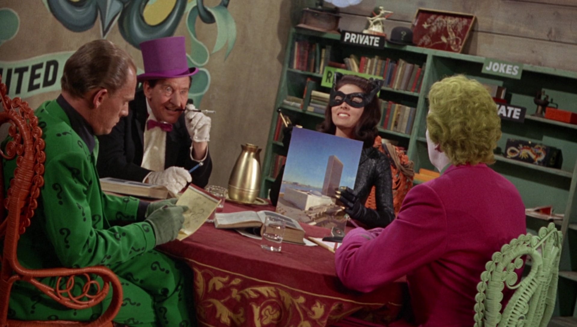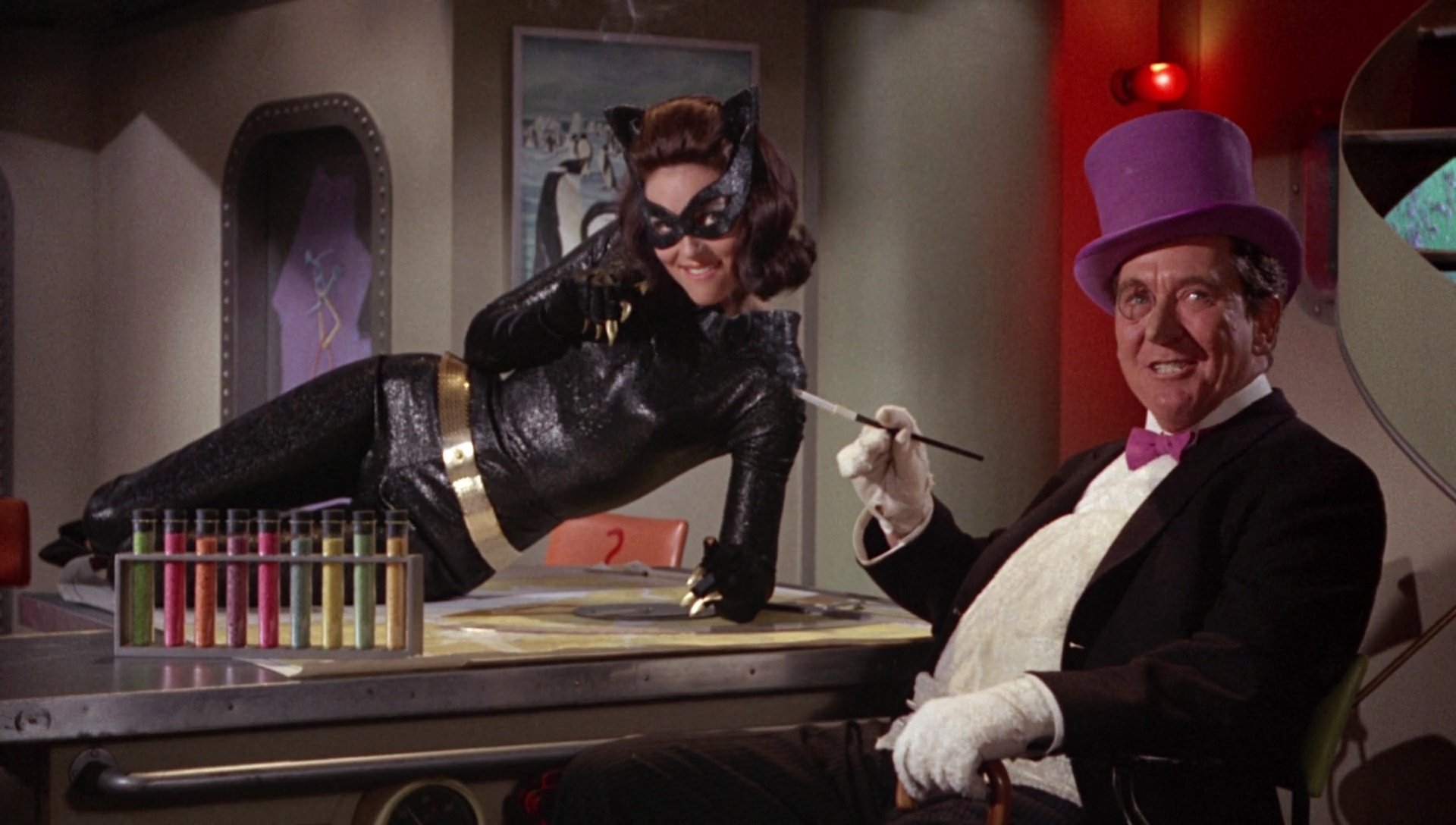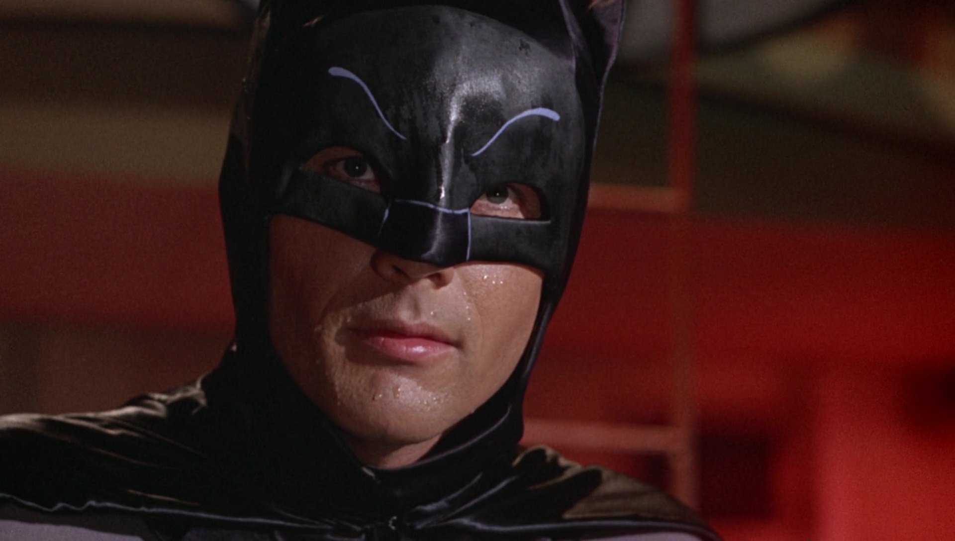 Its use of tilted ‘Dutch angles’ for villain lairs, wide framing to accommodate costume design and physical comedy, and static compositions to emphasise theatrical blocking rather than dynamic cinematic movement gave the film an uncommon style, wrapped in a touch of self-aware absurdity.