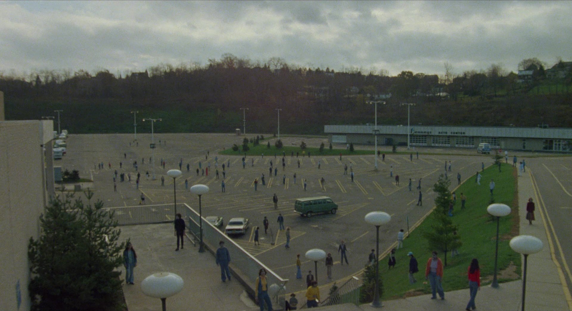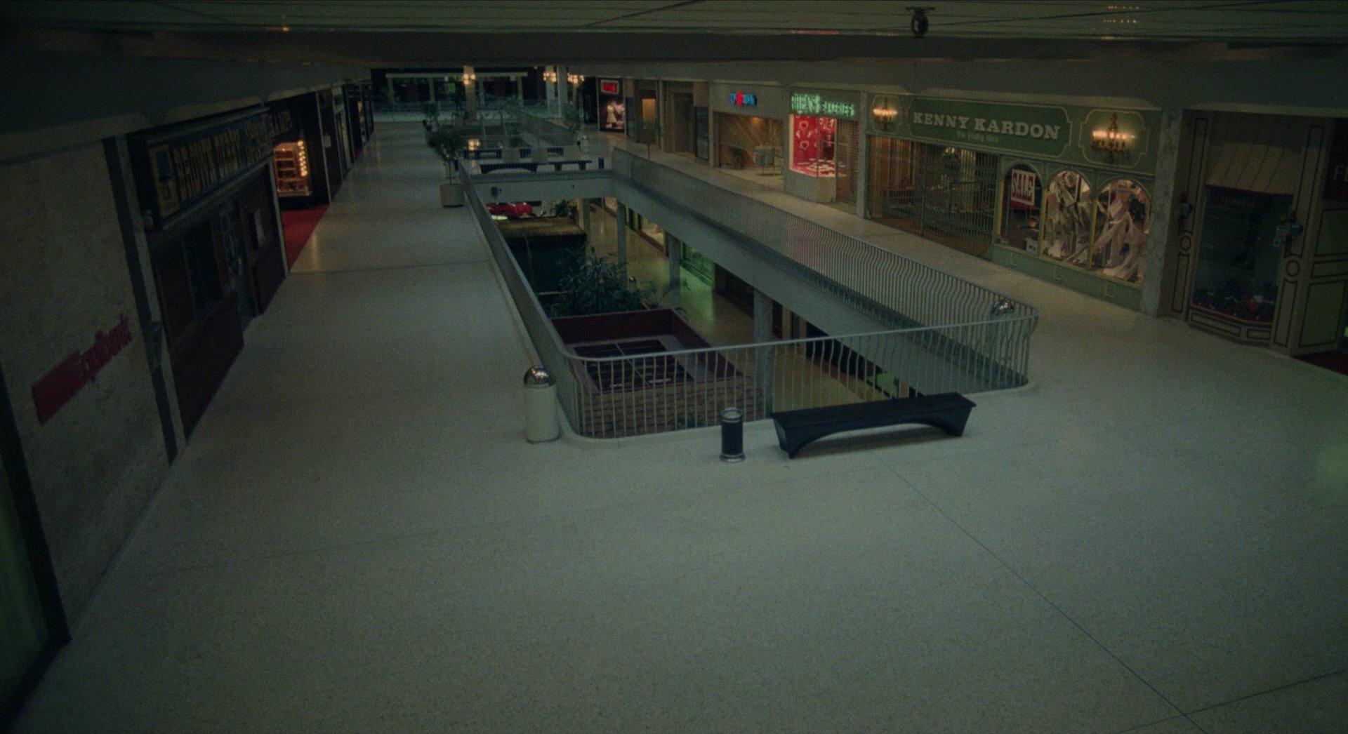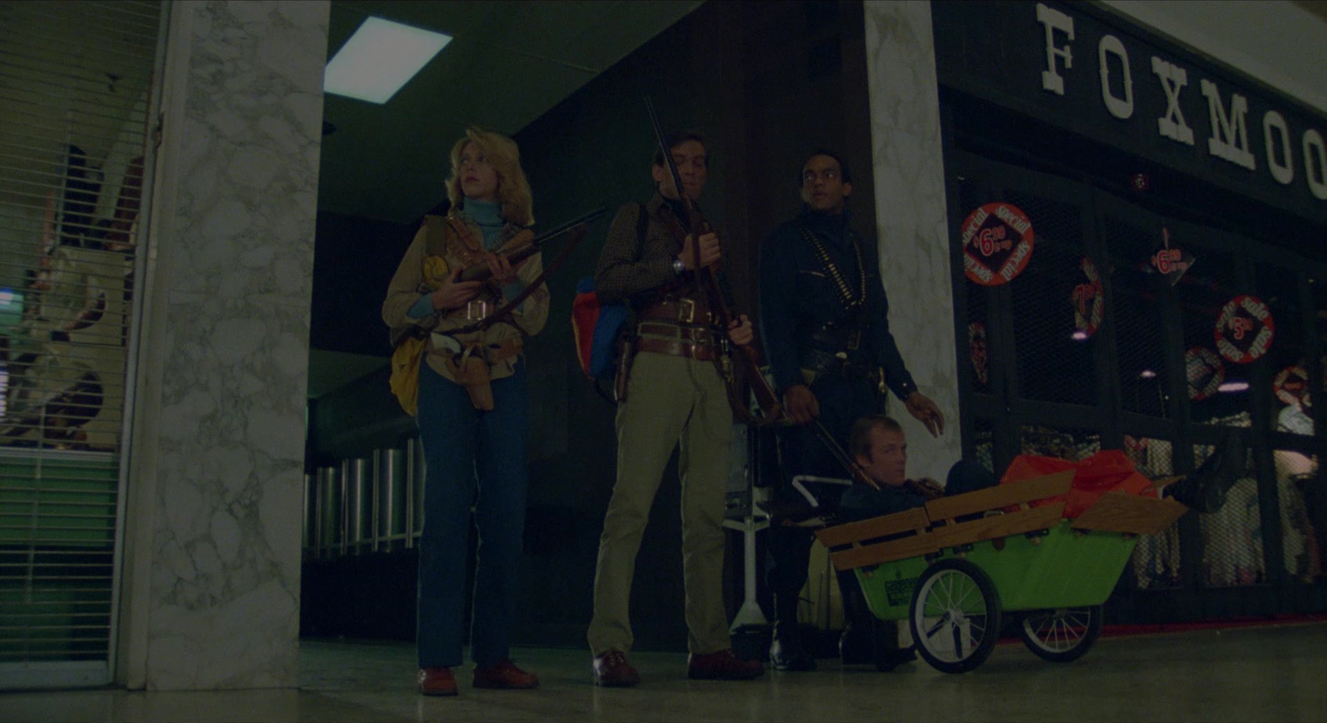 Principal photography took place inside the Monroeville Mall, with filming largely occurring at night after the mall had closed. This location serves as the film’s primary visual concept and as a metaphor for consumer culture. Long interior corridors, large open atriums, brightly lit retail spaces, and colourful storefront displays create a vividly artificial environment that contrasts sharply with the violent chaos unfolding within.