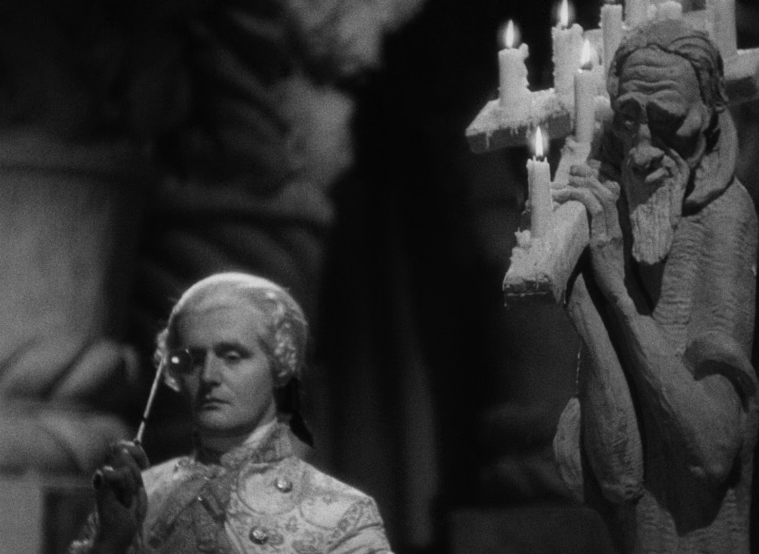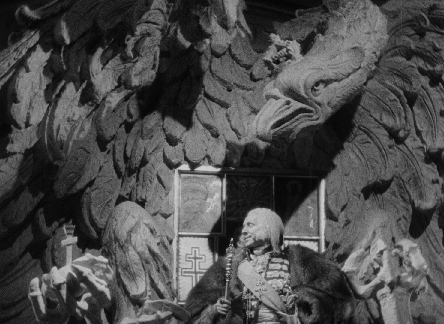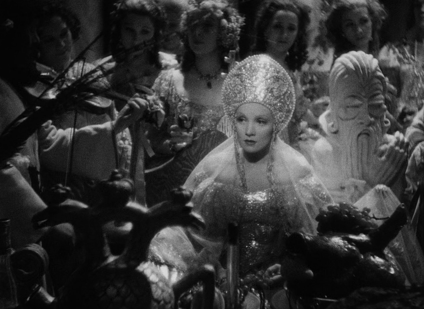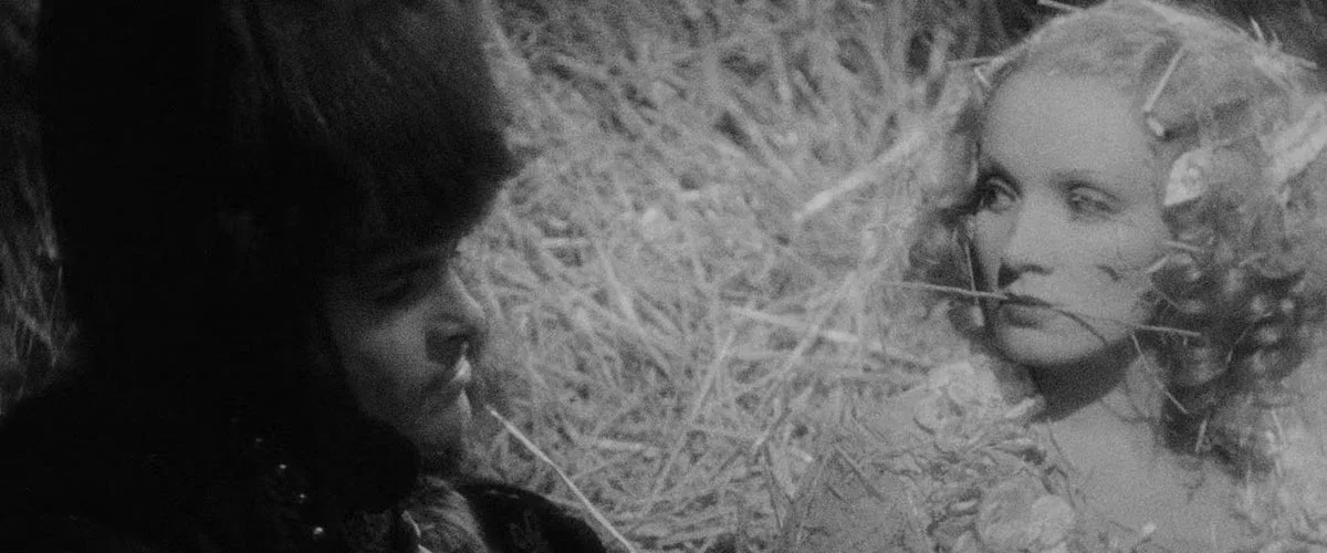 The film itself is one of the most visually extravagant of 1930s Hollywood. The frames are filled with texture and symbolic detail, and monumental, grotesque sculptures dominate the palace interiors. Extreme side-lighting and backlighting isolate Dietrich in halos and often make faces emerge from darkness rather than natural illumination. Veils, lace and shadow are also used to create layered depth. The Scarlet Empress is a feast for the eyes. It is so rich and grandiloquent, and Dietrich’s performance makes it all feel so alive.