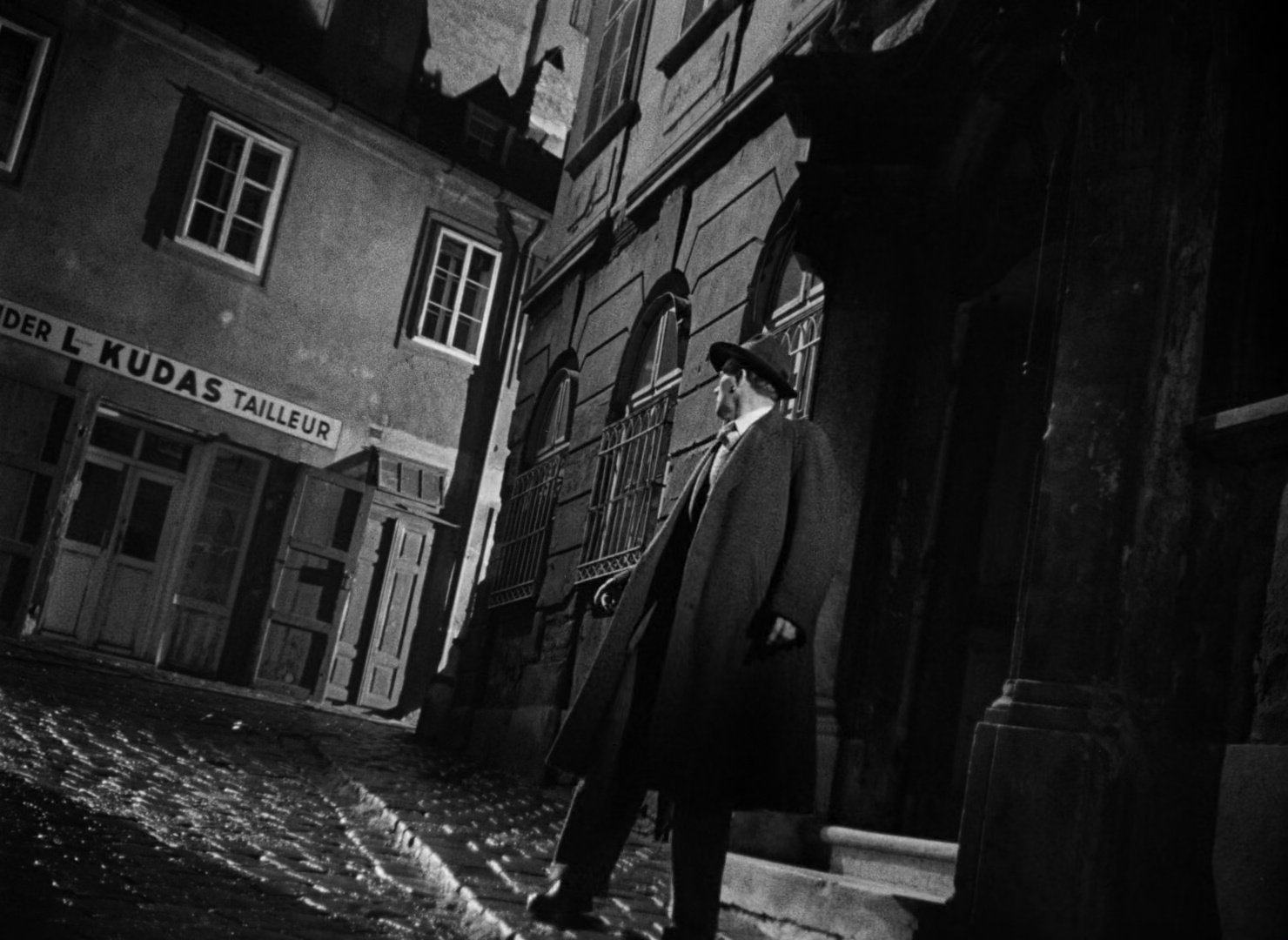 Vienna is rendered as fractured geometry rather than a neutral backdrop. Within this unstable landscape, Harry Lime is able to vanish as easily as he appears, slipping into darkness and alleyways until the inevitable confrontation in the sewers. The famous climax beneath the city transforms urban infrastructure into a labyrinth, bringing the film to a close with a space that reflects its themes of corruption, duplicity, and post-war disorientation.